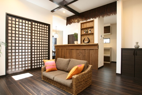 ![]() | 白とダークブラウンの配色で落ち着いた感じで玄関横の格子は目隠し代わりにもなり実用性とデザイン性もある外観。東・西・南側には住宅が建ち並び、北側道路に面した立地で、恵まれた環境ではありませんが、リビング吹抜け上部のトップライトから光が降り注ぎ、リビングだけではなくダイニング、キッチン、1階にある和室にも光が充分届くように設計していてます。キッチンには古木を使ったカウンターバーを設けリゾートな雰囲気を演出してます。ブラウン系の梁はリビングだけでなく2階寝室勾配天井も梁を走らせシーリングファンと共にアジアンスタイルな雰囲気に。格子を採り入れた造作建具も特徴的で、段差の少ない玄関ポーチも特徴の一つで、出入りがしやすく住む家族に優しいリゾート感あるアジアンスタイルプレゼンハウスR | |