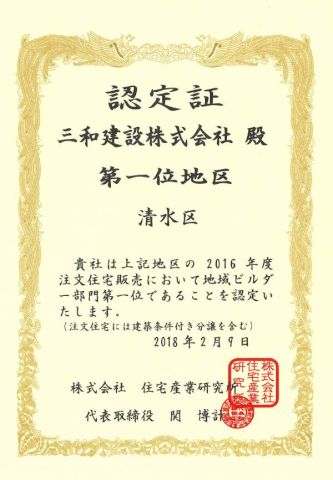 | 清水区ホームビルダー部門「第一位」に認定されました。 | |
