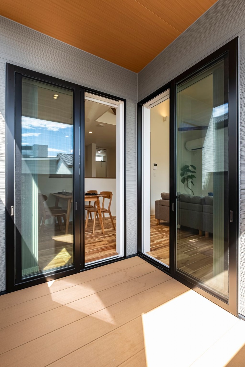 LDKと一体的に使える、ウッドデッキ仕様のバルコニー