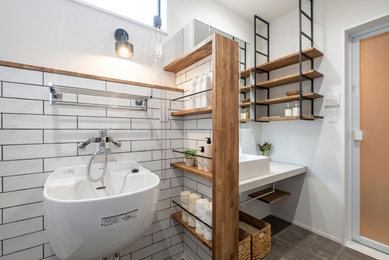 ランドリールームは三和建設の空間シリーズ「快乾空間®」。洗濯物を「洗う、干す、畳む」が一つの空間で完結。スロップシンク設けており、ぞうきん等の掃除道具、アウトドア用品、上履き、汚れた靴などを洗うのに活躍します。