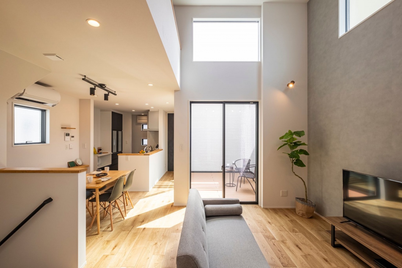 LDKからつながるデッキスペースは、壁を立ち上げて外部からの視線をシャットアウト。外空間とつながりながらも、日中カーテンなしで安心して過ごせるプライベート空間となっています。更にLDKは吹き抜けでロフトとつながっており、LDKを中心に家族が程よい距離でつながります。