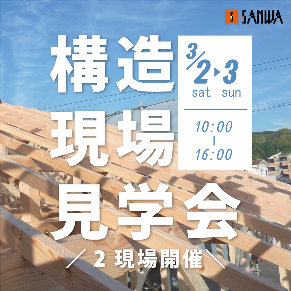 2024年02月26日 イベント 3/2(土)3(日)構造見学会【駿河区敷地/清水区七ツ新屋】 下記の通り構造見学会を開催いたします ・日時 3/2(土)3(日)10:00~16:00 ※予約制 ・場所 ①静岡市駿河区敷地 ②静岡市清水区七ツ新屋 ※2会場開催 詳細は関連リンクをご覧ください 関連リンク:https://www.sanwagr.co.jp/event/detail.php?e=86
